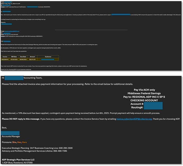 ADP has received reports about fraudulent emails being sent to ADP clients. These emails do not originate from ADP, and our analysis has revealed that they may contain malicious content. We're working with our fraud prevention team and anti-phishing vendor to address this incident. Please see the example below, which may vary in content and sender. See examples below: