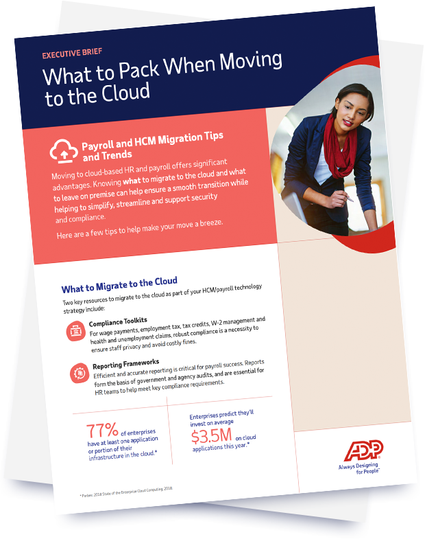 Moving to cloud-based HR and payroll offers significant advantages. Yet, 80% of businesses are shifting some of their workload back to on-premise servers or private cloud solutions due to security and privacy concerns.1 Knowing what data to migrate and what to leave behind can help ensure a smooth transition and support compliance.