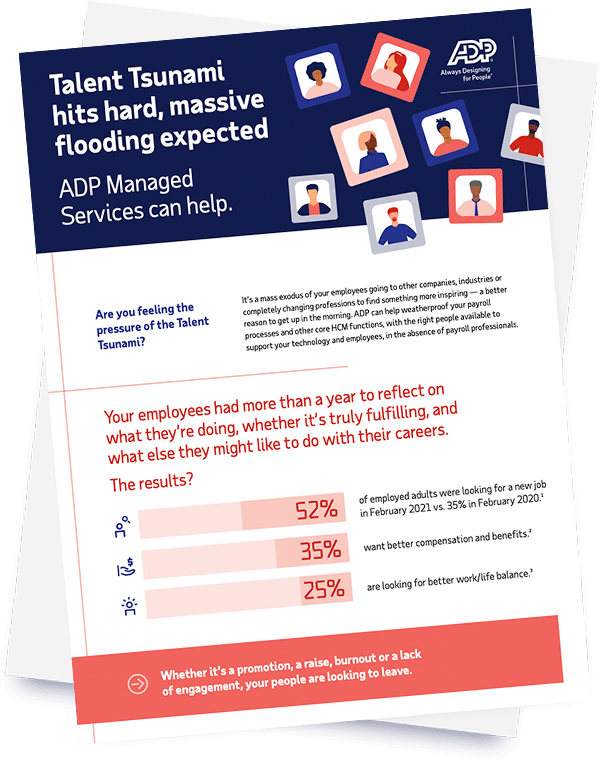 If you’re not prepared for this unprecedented labor shortage, ADP HCM Managed Services can help. Our specialists will become an extension of your team and provide dedicated expertise so you can have confidence that your payroll and other core HCM functions are taken care of according to best practices.