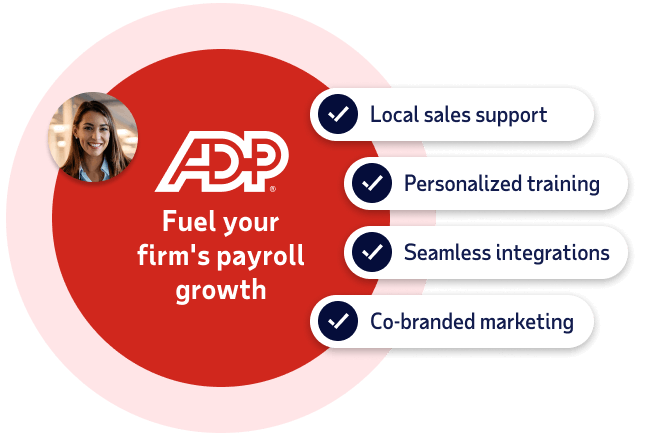 Leverage ADP’s leading technology while remaining the face of payroll processing for your clients. Our solution for partners can help you expand your advisory services and improve client satisfaction. Plus, you get unparalleled sales support, training and more.